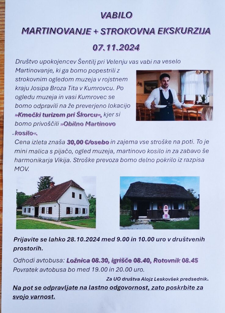 Društvo upokojencev Šentilj pri Velenju, vabi člane društva na izlet, ki bo v sredo 18.9.2024. Ogledali si boma Muzej vojaške …